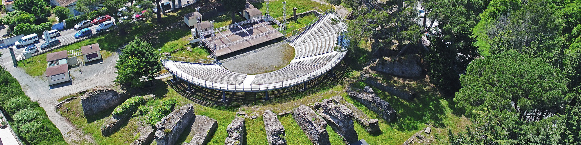 In the Roman city, the theatre hosts popular shows mixing music, song and dance. A heritage of Greek Culture, the semicircular-shaped Roman theatre has stands fanned out in front of the stage . A wall closes the perspective at the back of the actors and houses a carved decoration. The theatre of Forum Iulii, built in the first century AD, is part of the northeast district of the city near the Door of Rome. The remains still standing make the overall structure of the building legible and suggest the size and splendor of this monumental structure.