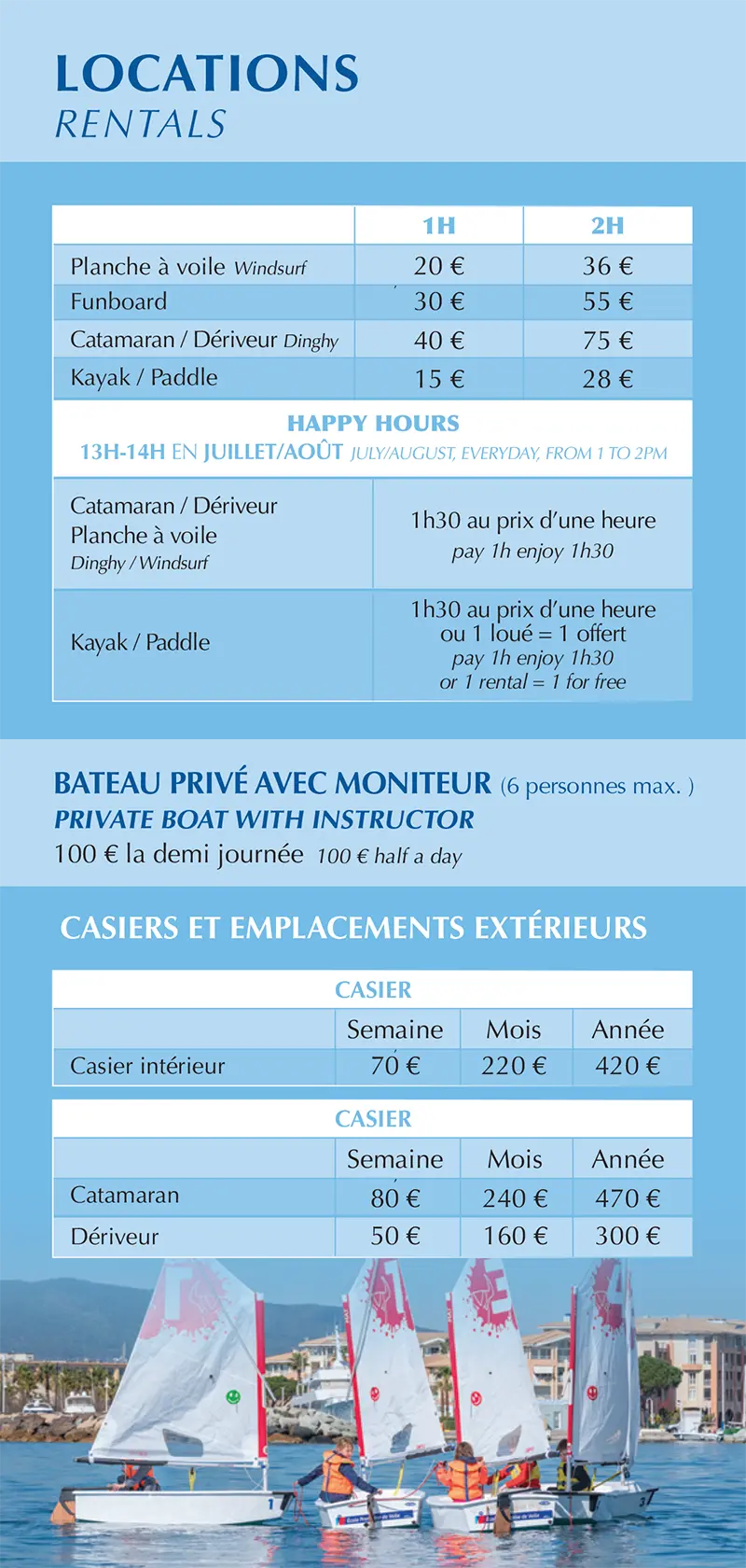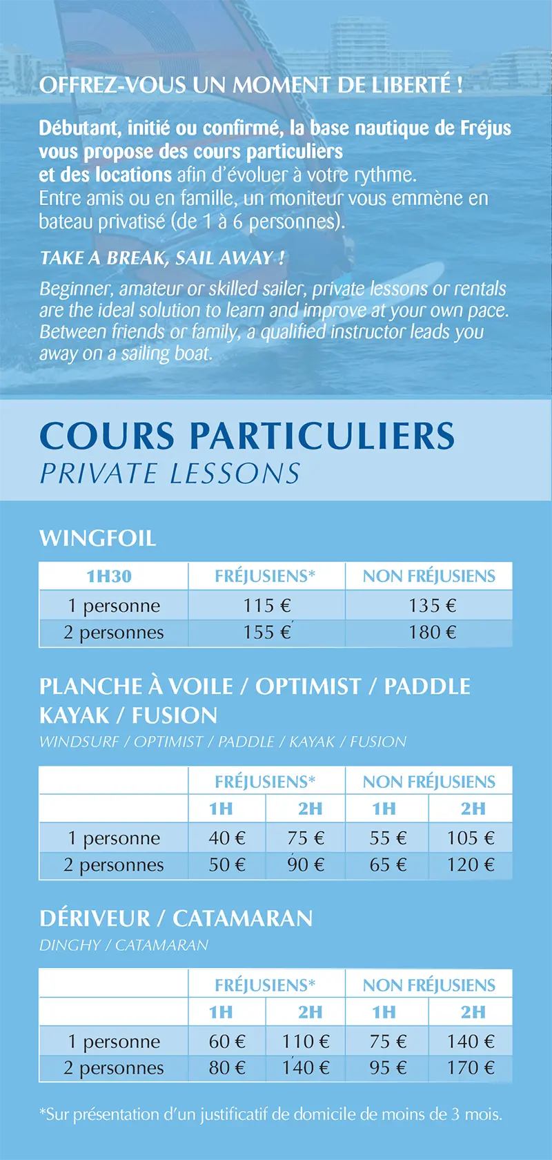 Les cours particuliers et la location sont ouverts du lundi au vendredi. N’hésitez pas à nous contacter : 04 94 51 10 97 ou basenautique@ville-frejus.fr.