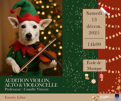 Les élèves de la classe de cordes : violon, alto et violoncelle de notre professeur Camille Vincent se présenteront en audition le samedi 13 décembre 2025 à 14h00 à l’école de musique.