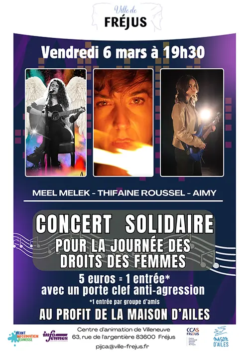 Lors de cet événement, un concert solidaire au profit de la Maison d’Ailes vous permettra d’apprécier le talent de 3 jeunes chanteuses: Meel Melek, Thifaine Roussel et Aimy.