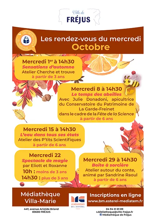 Mercredi 22 octobre à 10h (moins de 3 ans) et 14h30 (plus de 3 ans)